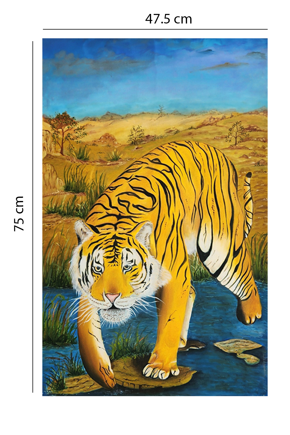 “Nadi Par Vanraj” portrays the tiger in its most elemental form—graceful, powerful, and deeply connected to its terrain. The composition captures the majestic creature mid-step, one paw poised on a rock as it crosses a shallow stream. Its vivid orange coat, bold black stripes, and white underbelly are rendered with lifelike precision, while the surrounding landscape—dry grasslands, sparse trees, and a soft blue sky—grounds the scene in serene realism. The painting is executed using original mineral pigments, lending it a rich, tactile finish and timeless color integrity. This artwork celebrates motion, wilderness, and the quiet authority of nature’s sovereign—perfect for interiors that value storytelling, strength, and visual immersion.
