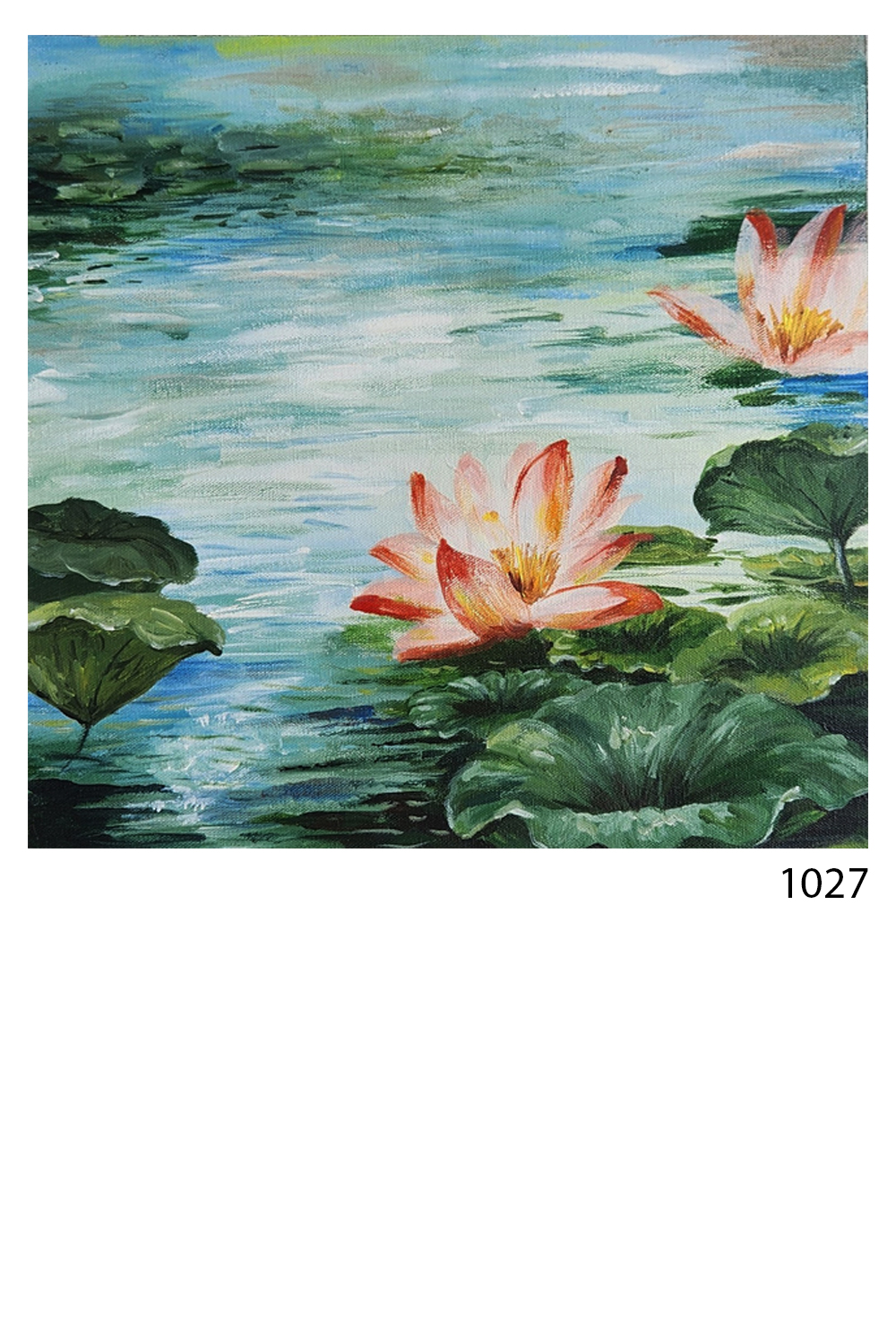 - Depicts two blooming water lilies surrounded by lily pads on a tranquil pond