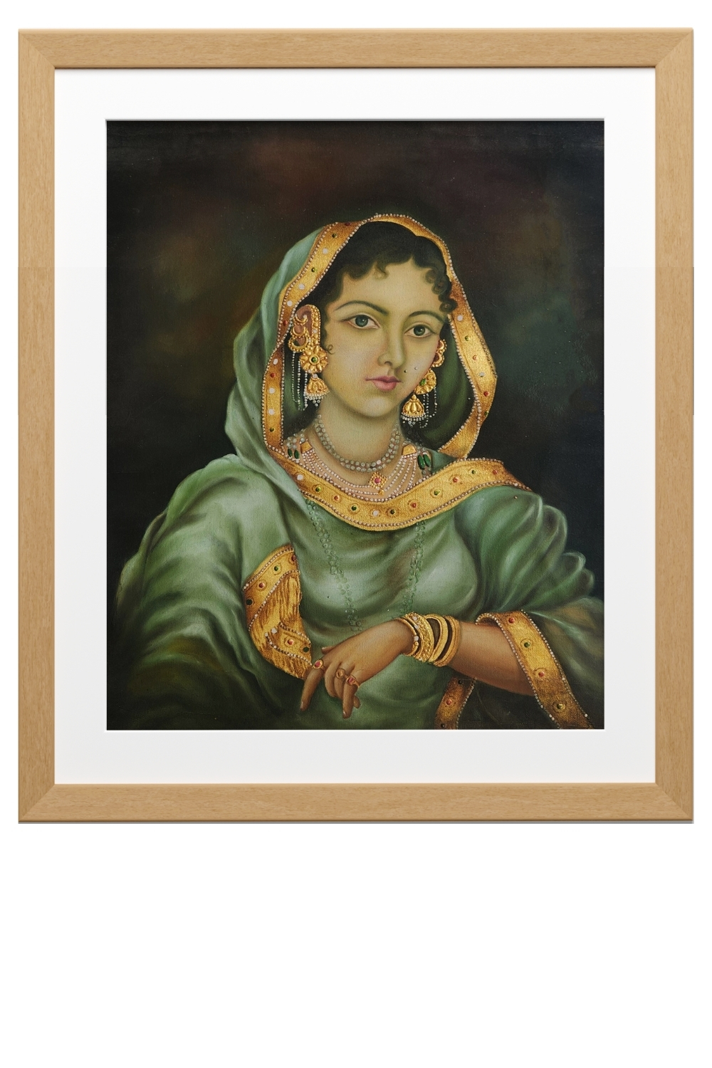 “Emerald Grace” is a richly detailed oil painting that captures the timeless elegance of a noblewoman from South Asian heritage. Dressed in a green garment with golden embellishments and a matching headscarf, she is adorned with intricate jewelry—gold earrings, layered necklaces, and bangles—that shimmer against the dark, dramatic backdrop. Her pose is poised and contemplative, with one hand resting gently on her lap and the other slightly raised, evoking a sense of quiet dignity and inner strength. Painted using original mineral pigments, the artwork reflects a deep reverence for classical portraiture and traditional aesthetics. This piece is ideal for collectors, cultural spaces, or interiors that celebrate feminine grace and historical richness.