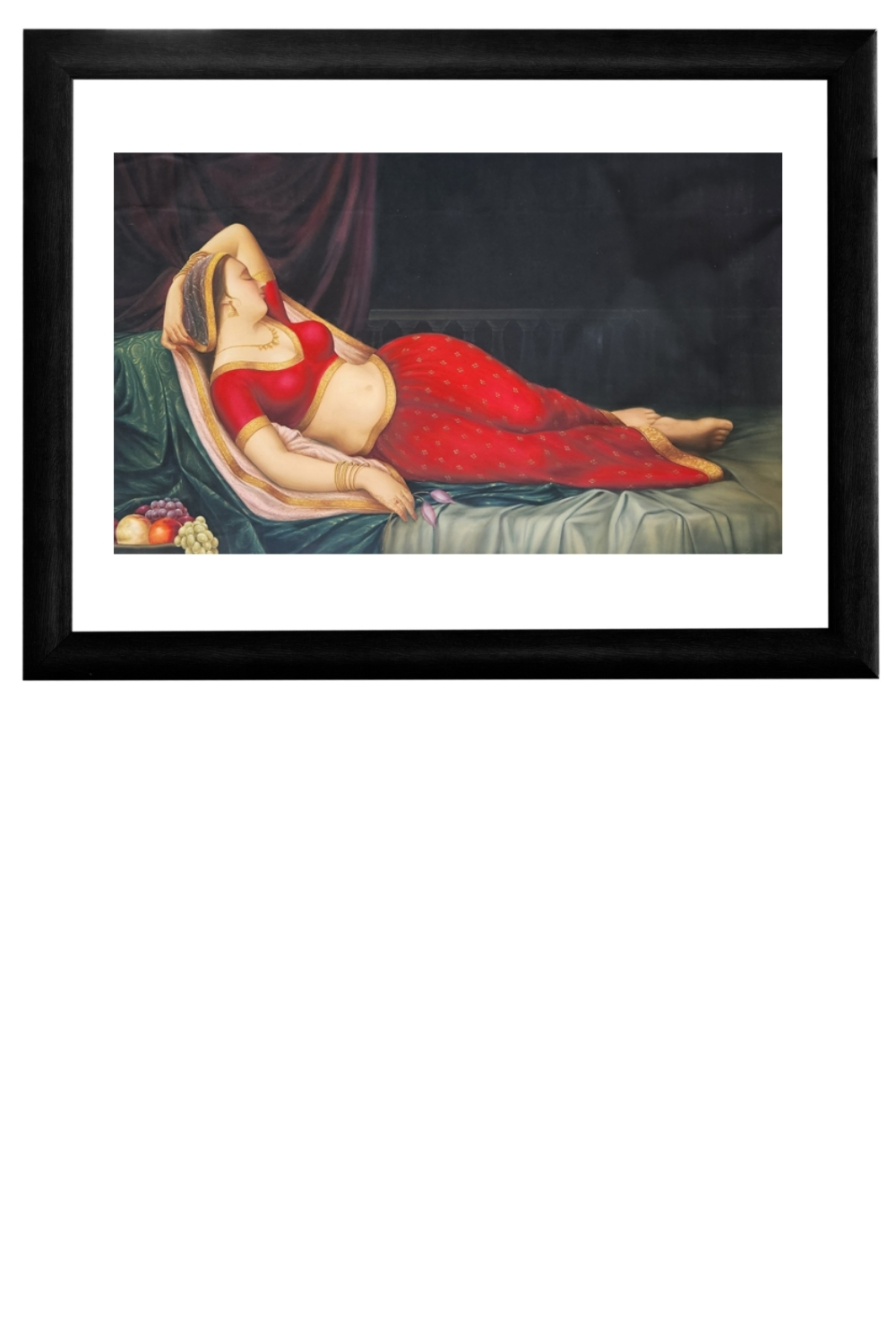 Vishraam captures a moment of serene elegance—a woman reclines gracefully on a plush divan, enveloped in the richness of traditional Indian textiles and jewelry. Her red sari, embellished with gold, flows around her like a tapestry of heritage, while her posture exudes quiet confidence and leisure. The dark, moody background hints at a luxurious interior, subtly framing her presence without distraction. A small arrangement of fruits near her adds a touch of domestic opulence. Painted with original mineral pigments, this oil artwork carries a timeless depth and tactile richness. It evokes themes of femininity, rest, and cultural pride, making it a striking centerpiece for interiors that celebrate Indian heritage and refined storytelling.