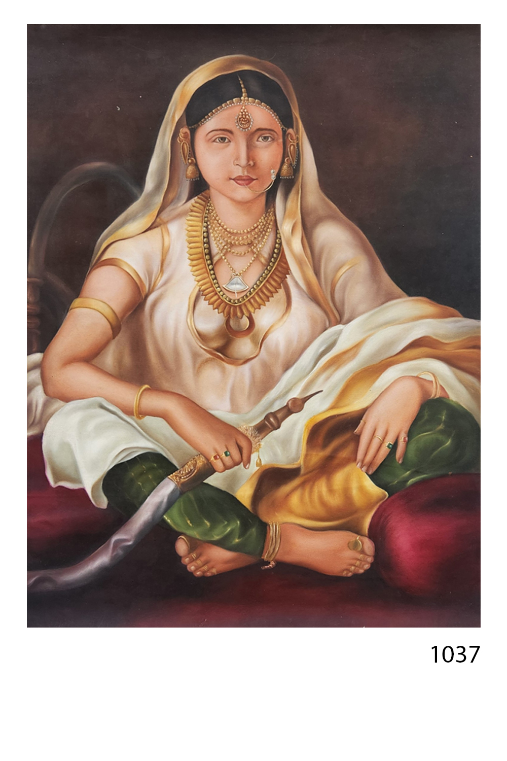 "Rajnayi: The Seated Sovereign" is a hand-painted oil artwork that celebrates the quiet power and elegance of Indian womanhood. Rendered in original mineral colors, the painting captures a queen-like figure adorned in intricate gold jewelry—maang tikka, bangles, necklaces—seated in serene command with a sword resting across her lap. Her white saree with golden borders and green leggings evoke purity and prosperity, while the dark backdrop intensifies her luminous presence. This piece is a tribute to feminine strength, cultural richness, and the layered storytelling of Indian portraiture. Ideal for collectors and connoisseurs of heritage art, it brings a museum-like aura to any space.