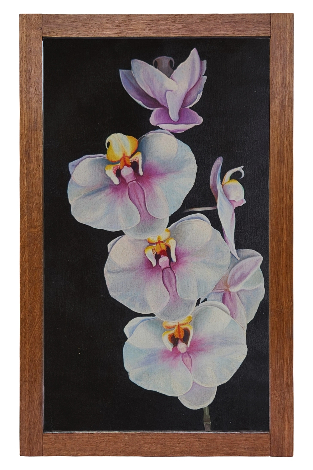 “Nargis Ki Chhaya” is a hand-painted canvas that celebrates the delicate beauty of orchids through a refined, heritage-inspired lens. Set against a deep black backdrop, the vertical arrangement of white orchids—tinged with soft pinks, purples, and golden centers—evokes both realism and poetic restraint. Each petal is rendered with precision, using original mineral colors that lend depth, texture, and timeless vibrancy. The composition invites stillness and contemplation, making it ideal for curated interiors, campaign visuals, or collectors seeking botanical elegance with cultural soul. This piece is a tribute to nature’s quiet grandeur, painted with emotional clarity and artisan finesse.