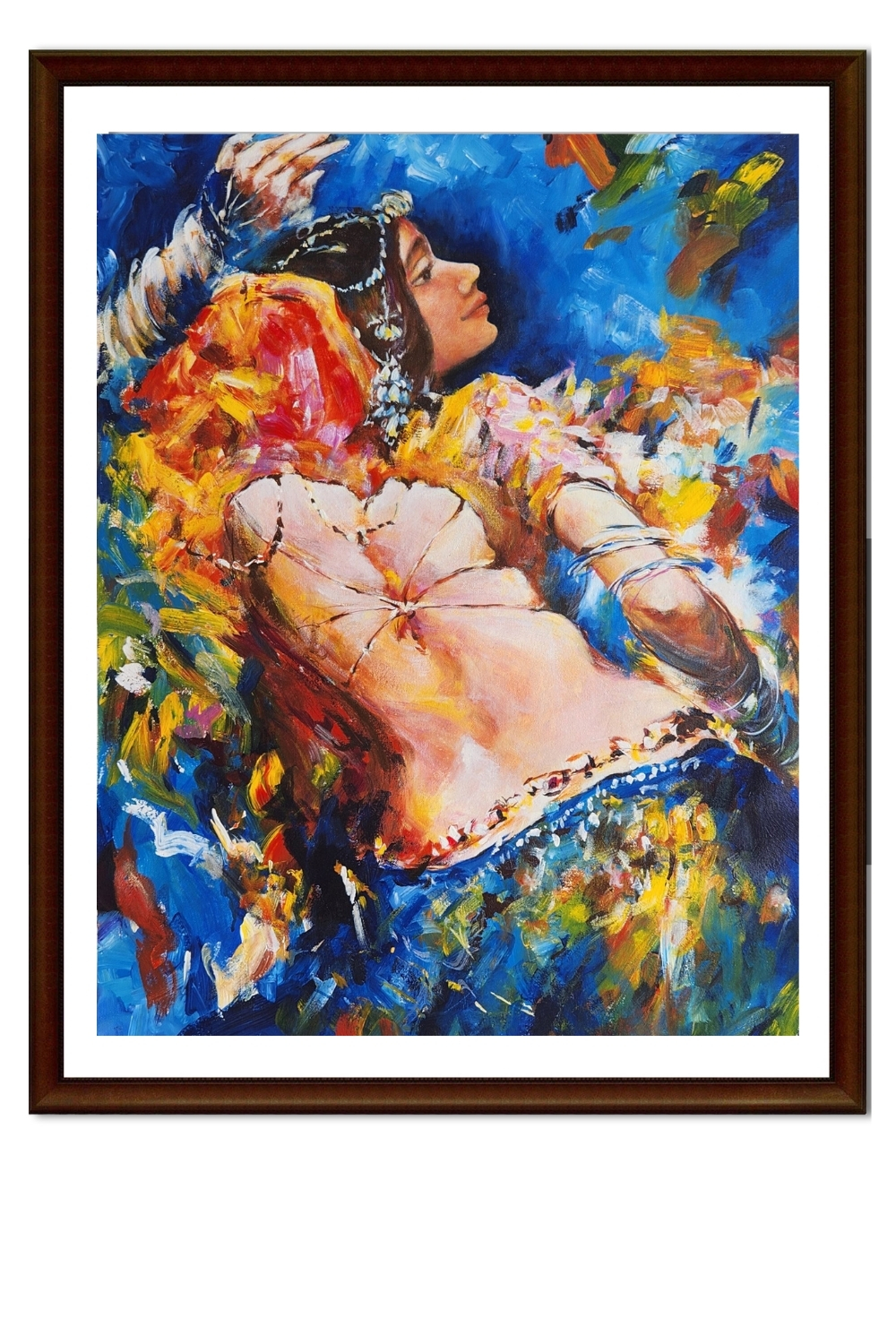 - Depicts a dancer in expressive motion with traditional costume and jewelry