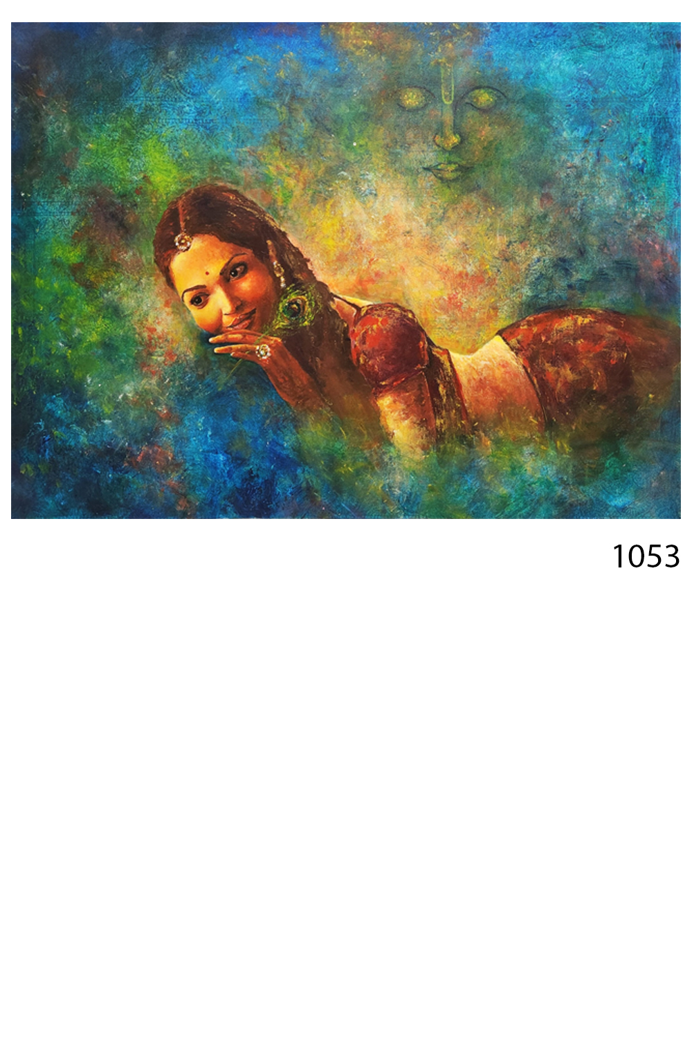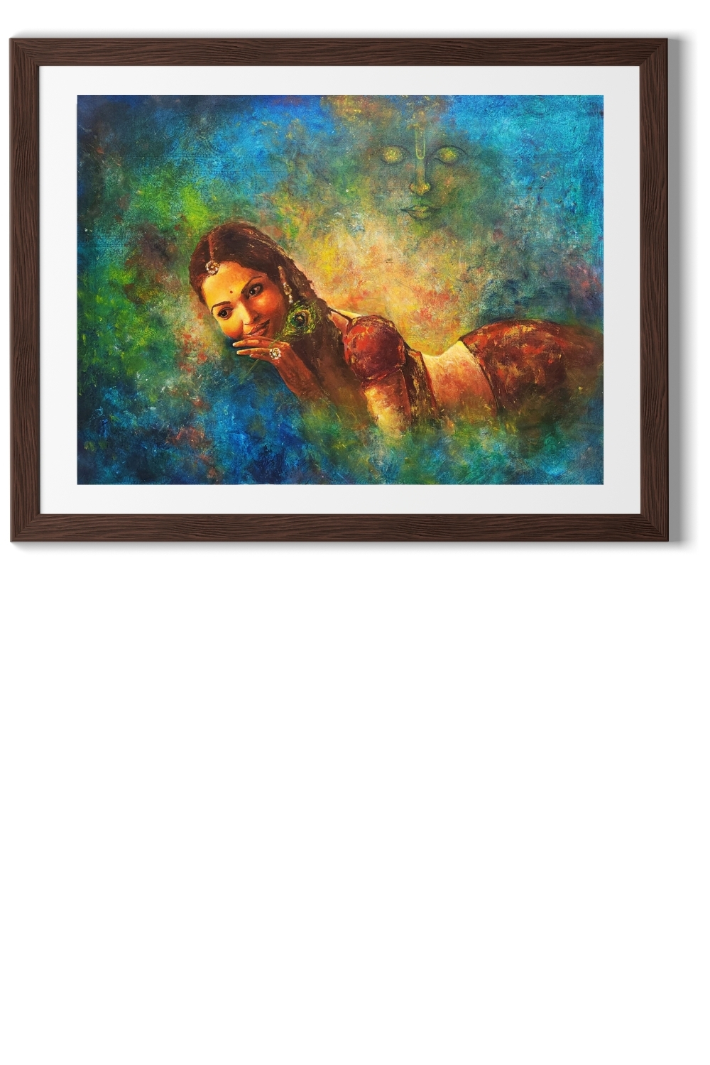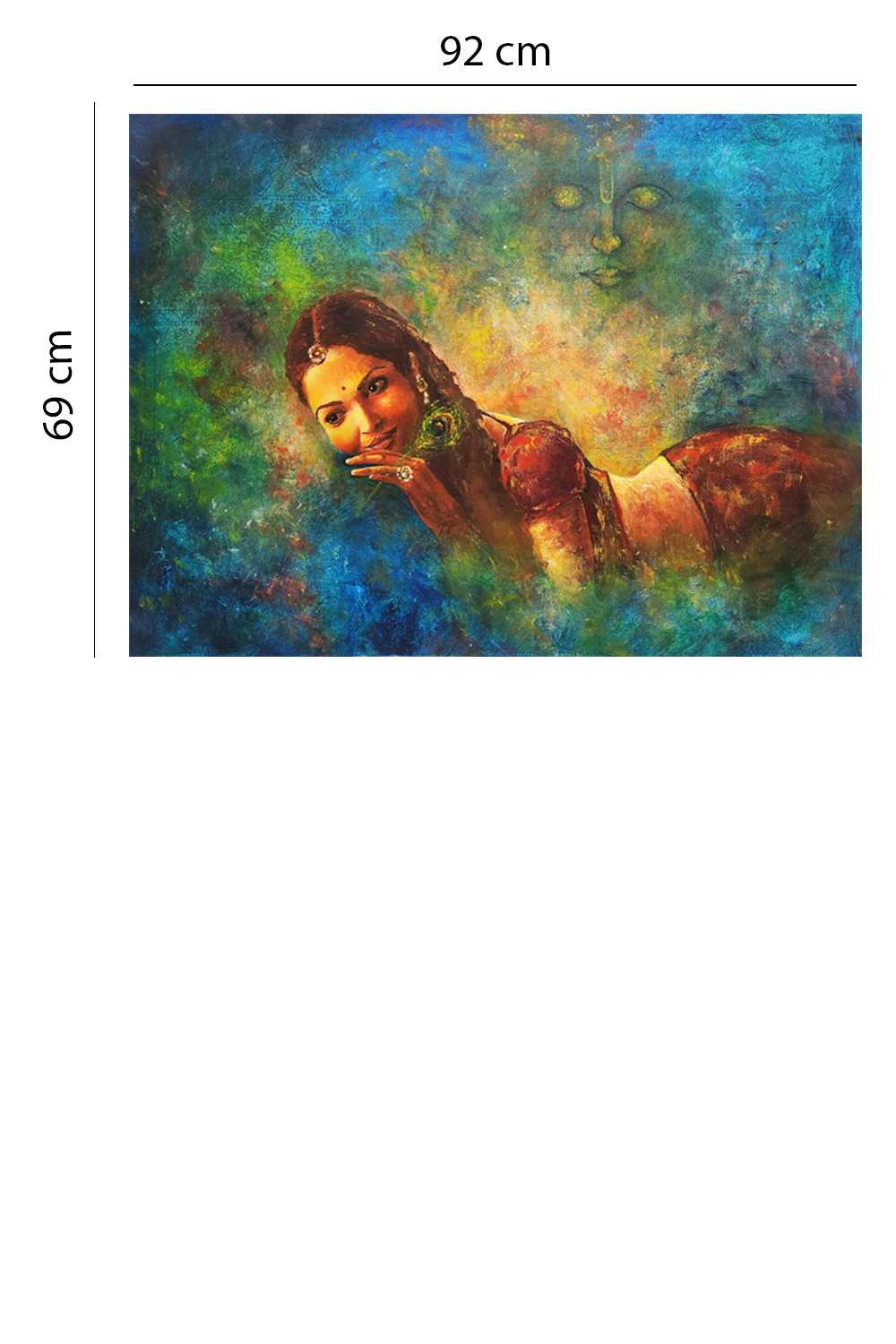 “Antarvasna” is a hand-painted canvas that explores the intimate space between human emotion and spiritual presence. A woman, adorned in traditional jewelry and attire, lies in serene repose—her gaze inward, her posture reflective. Surrounding her is a mystical landscape of layered blues, greens, and earthy tones, where abstraction meets symbolism. Subtly emerging from the upper background is a ghostly visage, possibly divine, adding a metaphysical dimension to the composition. Painted entirely with original mineral colors, this artwork carries the tactile richness and timeless luminosity of heritage technique. Ideal for curated interiors, exhibitions, or poetic campaign visuals, it evokes longing, surrender, and the quiet power of spiritual connection.