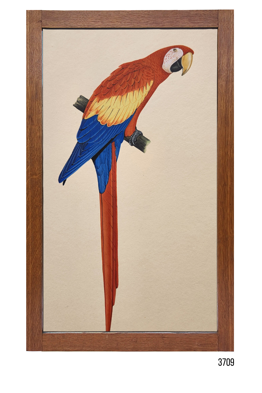 The Crimson Azure Parrot Miniature Painting beautifully captures the vivid, reddish-blue tones of the parrot, highlighting its subtle elegance and natural beauty. Each detail of this hand-painted artwork is meticulously crafted on premium art paper, ensuring both durability and vibrant color reproduction. Its vertical orientation makes it an ideal choice for narrow spaces, while its lightweight design allows for easy framing and integration into various decor styles. Please note that the frame shown in the image is not included in the price but is available upon request at an additional cost. To preserve the painting's exquisite colors, avoid direct sunlight and clean gently with a soft cloth.