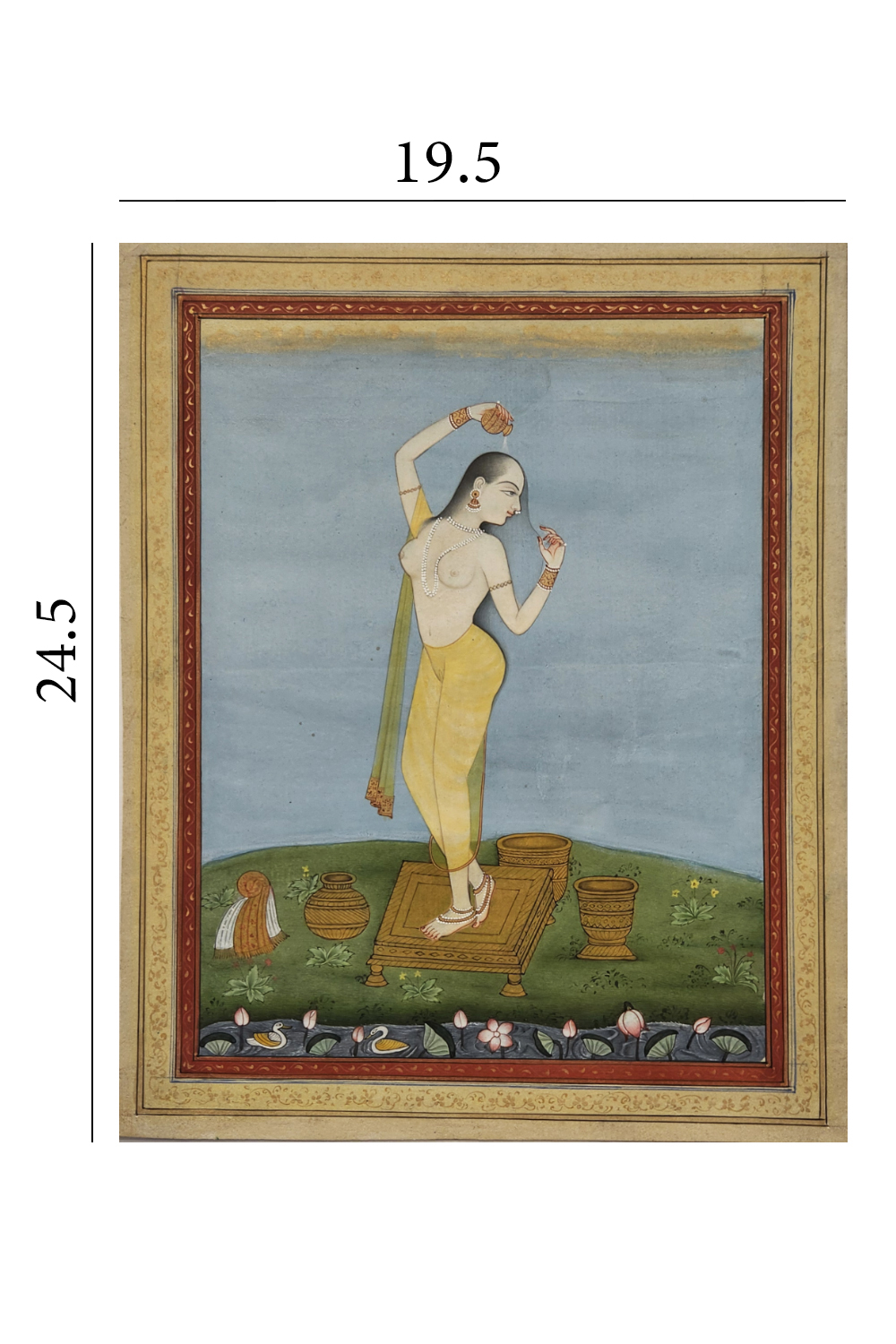 Step into the realm of subtle allure with the Silent Elegance Miniature Painting. This artwork, featuring a poised nude figure, showcases the beauty of simplicity through its delicate brushwork and minimalist style. Each stroke brings the figure to life, exuding grace and understated elegance. This handcrafted painting is perfect for enhancing intimate spaces like bedrooms or private collections, adding an air of sophistication and calm. The vertical orientation and compact size make it ideal for smaller walls or gallery setups, where it can command attention without overpowering the space.