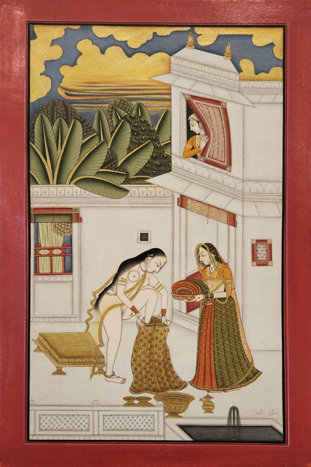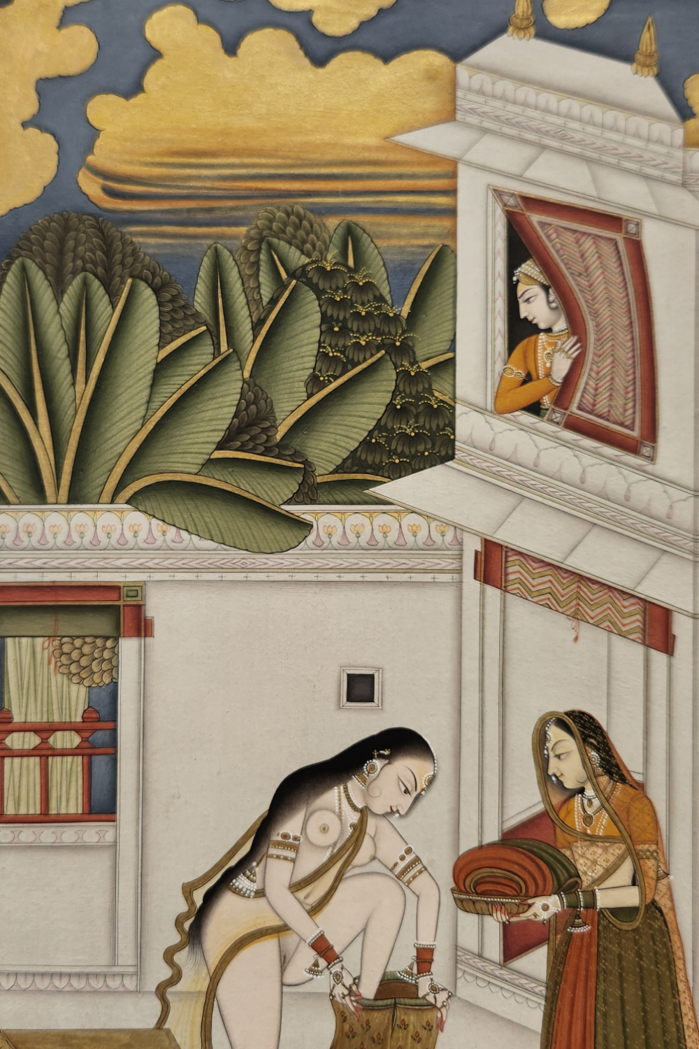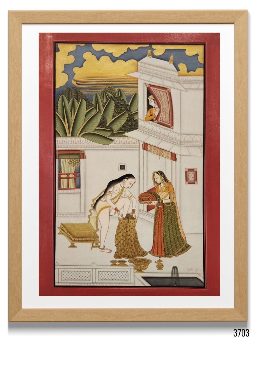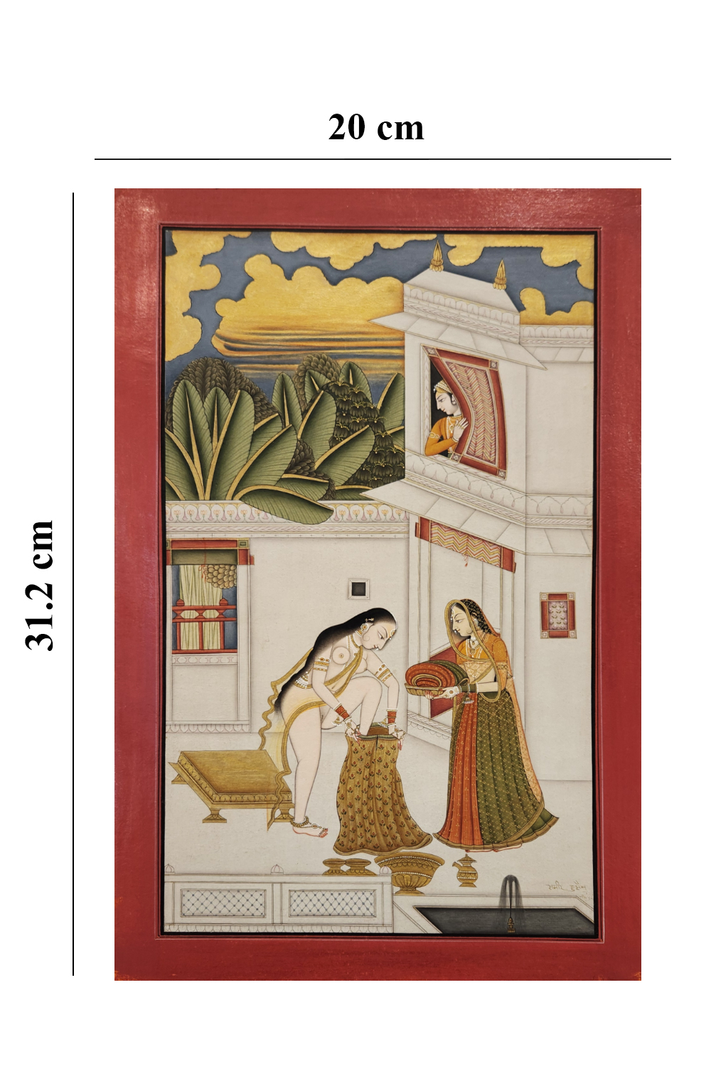Step into a moment of quiet allure with the Veiled Allure Miniature Painting, where the silent connection between two figures is portrayed with elegance and finesse. This handcrafted piece, with its delicate strokes and harmonious color palette, reflects the mystery and subtle emotions in the interaction between the man and woman. Its vertical orientation makes it perfect for adding depth and sophistication to narrow spaces, while the attention to detail ensures it will be a conversation starter in any room.