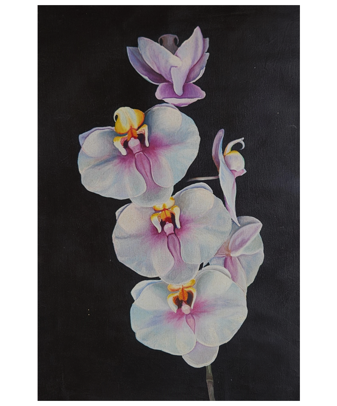 A graceful cascade of orchids blooms against black silence, capturing nature’s quiet drama in mineral hues.