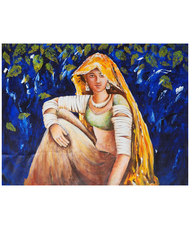 A solitary gaze meets the viewer beneath a canopy of deep blue foliage, where tradition and introspection quietly converge.