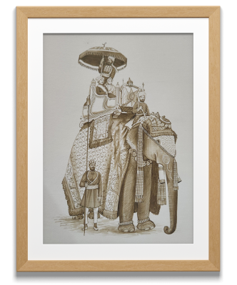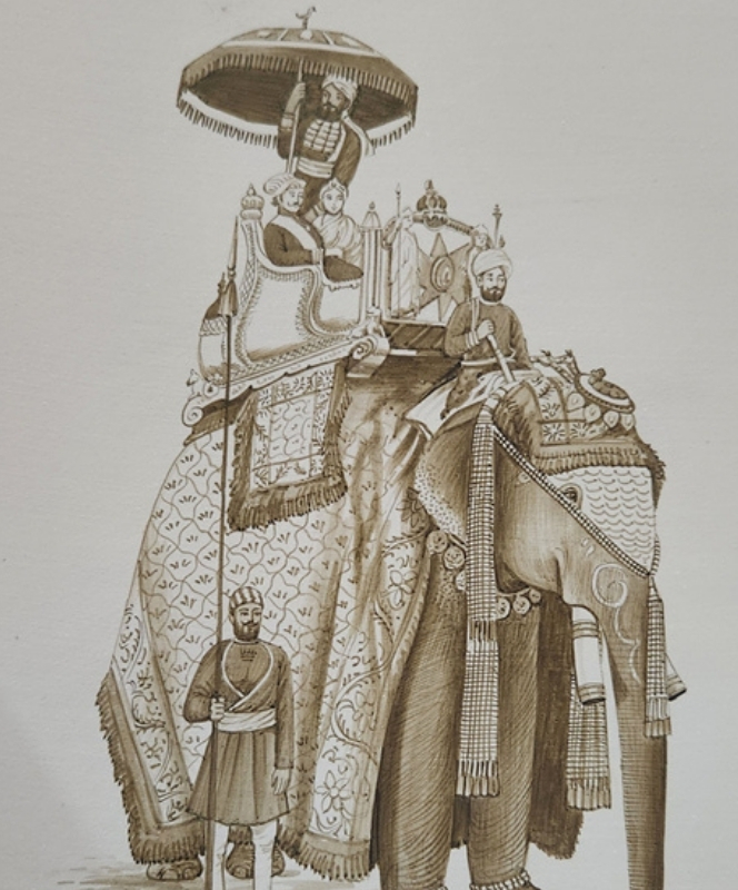 A detailed sepia-tone painting depicting a royal procession with an elaborately adorned elephant and its regal riders.