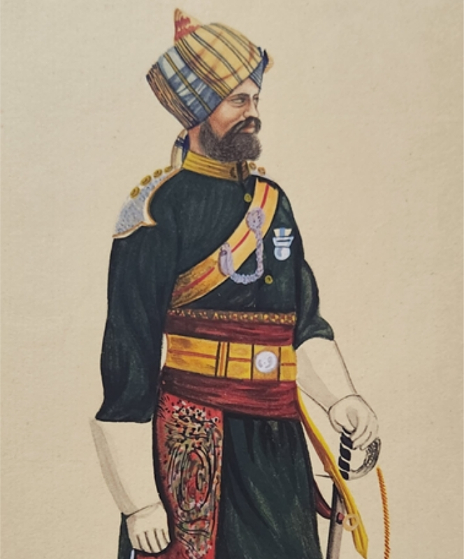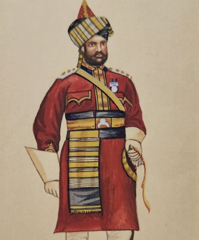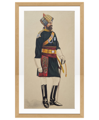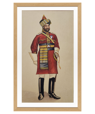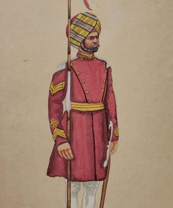 A detailed watercolor painting depicting a traditional guard in ceremonial attire.