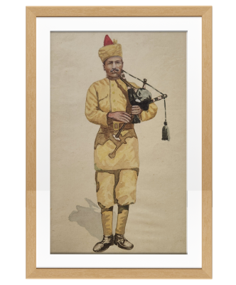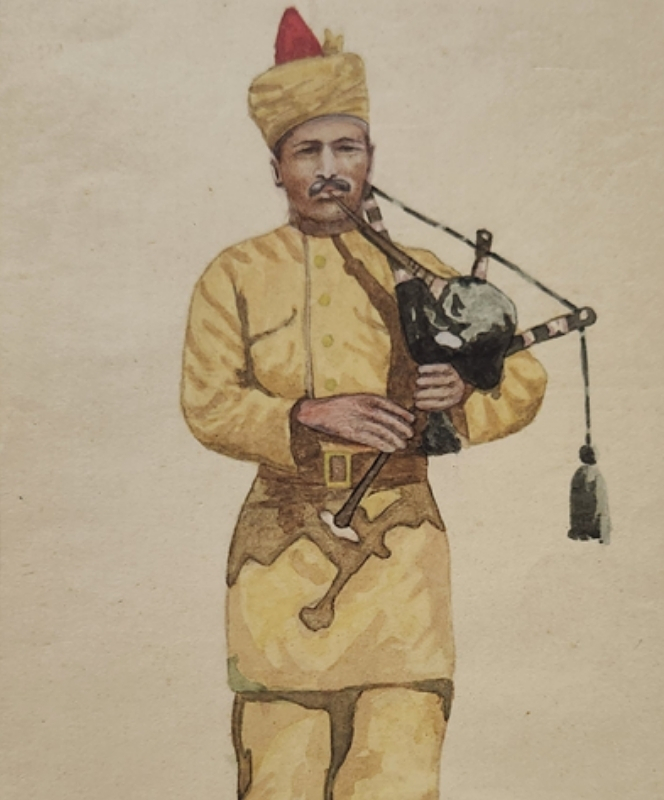 A watercolor painting depicting a bagpiper dressed in traditional attire playing the bagpipes.