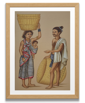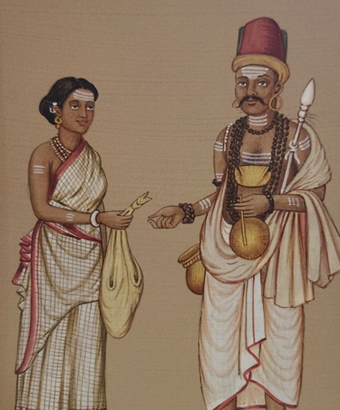 A watercolor painting depicting a traditional exchange between two individuals in historical attire.