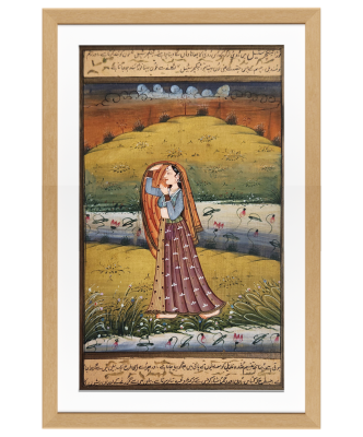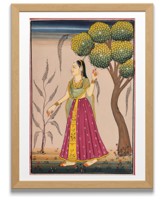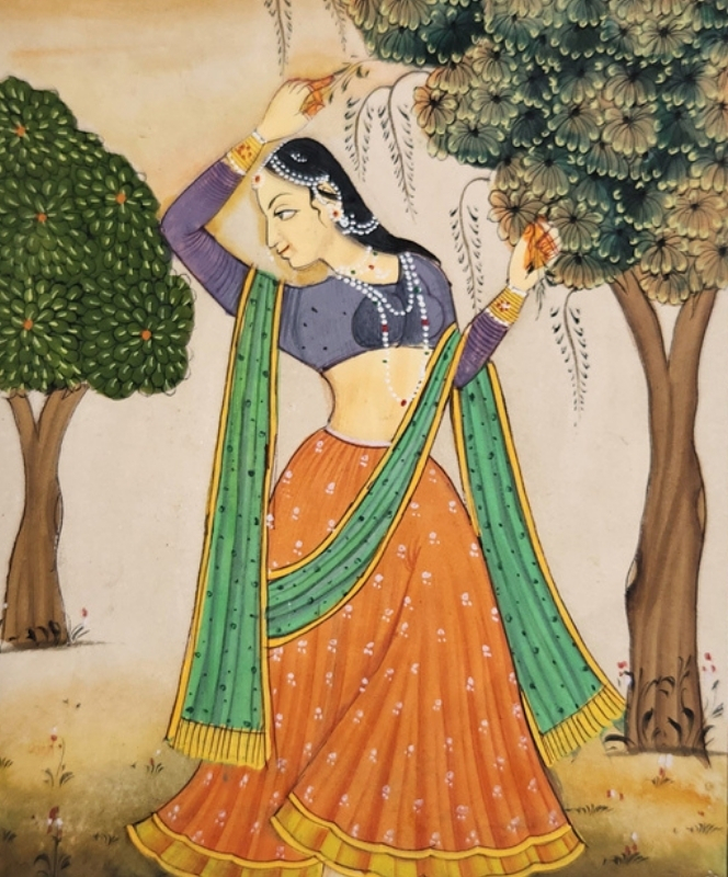 A traditional Indian miniature painting depicting a lady in vibrant attire holding a pot under a tree.