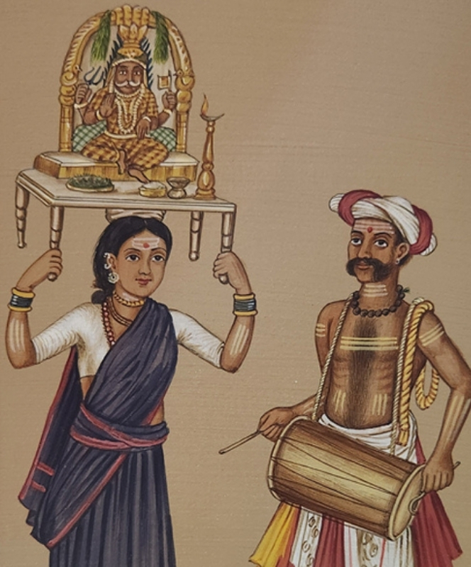 A vibrant watercolor painting depicting a traditional Indian procession with a woman carrying a deity and a man playing a drum.