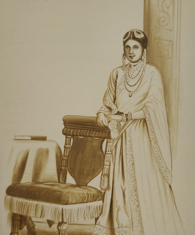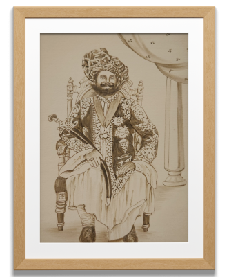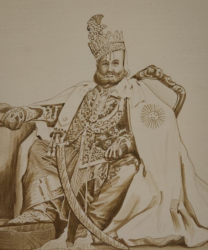 A sepia-toned watercolor painting depicting a regal figure in traditional attire, standing beside an ornate chair.