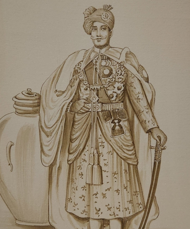 A sepia-toned watercolor painting depicting a regal figure adorned in traditional attire, holding a sword, with an ornate vessel in the background.