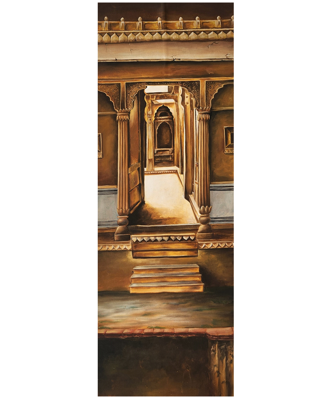 A captivating oil painting of a traditional corridor framed by ornate arches and columns, rendered in original mineral pigments.