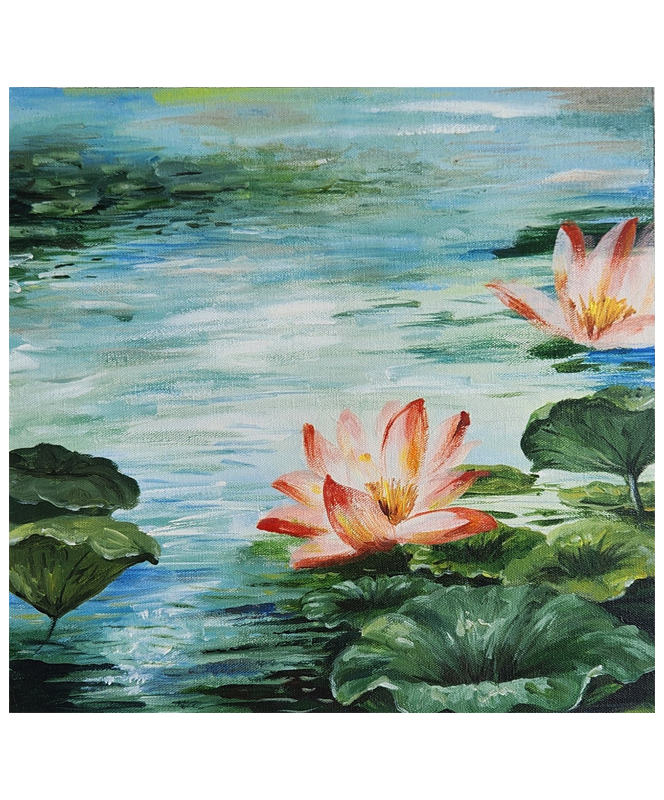 A tranquil oil painting of blooming water lilies floating on a serene pond, rendered in original mineral pigments.