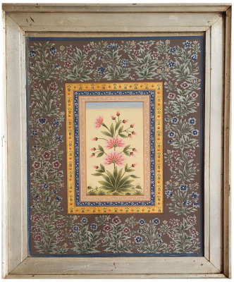 A Mughal-style miniature painting featuring a delicate floral motif framed by intricate geometric patterns.