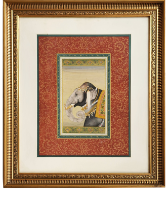 A detailed miniature painting of a decorated elephant adorned with traditional jewelry and attire, framed in an ornate golden frame.