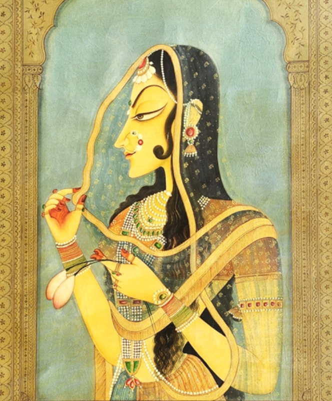 A captivating Bani Thani miniature painting showcasing a regal woman adorned in traditional attire and jewelry, exuding timeless elegance.