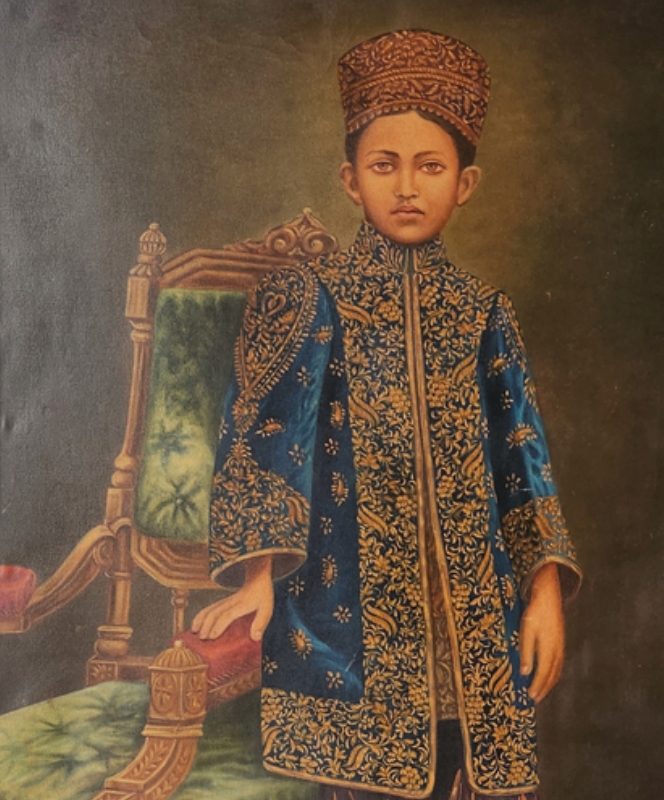 A detailed oil painting of a young person in ornate traditional clothing, standing beside an intricately designed chair.