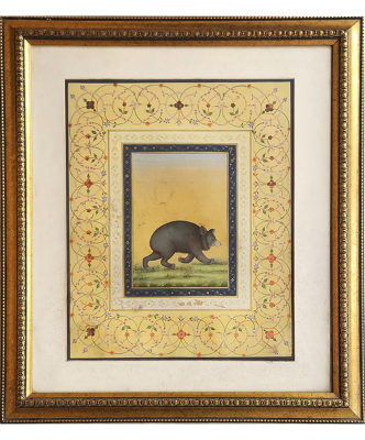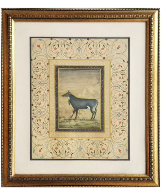 A Mughal miniature painting depicting a Nilgai, framed with intricate floral patterns