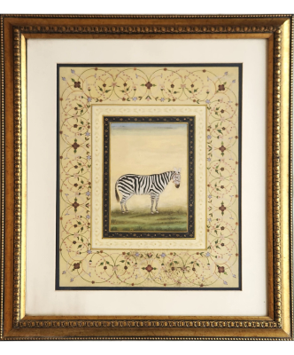 A miniature painting of a zebra standing on a grassy plain, surrounded by intricate floral patterns.