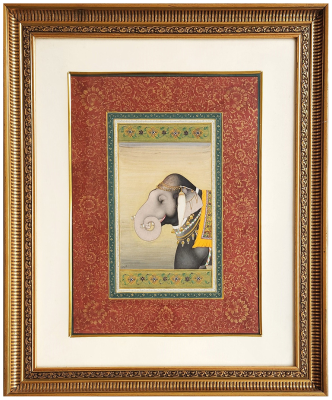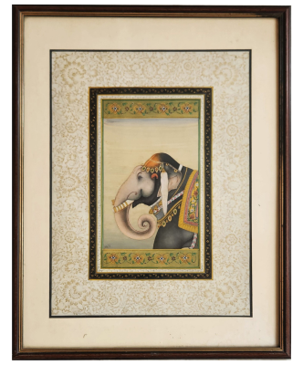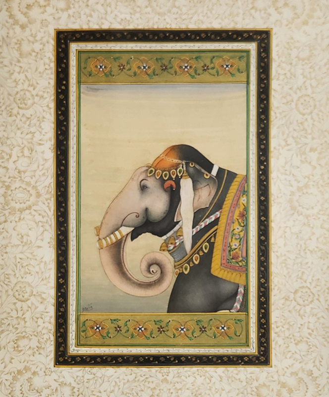 A detailed miniature painting of an adorned elephant in traditional attire, framed with intricate borders.