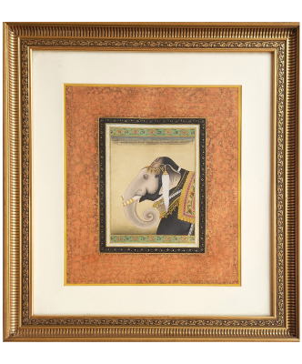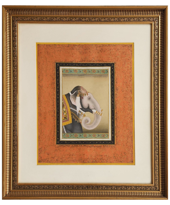 A detailed miniature painting of a regal elephant adorned with traditional ornaments, framed in an ornate golden frame.