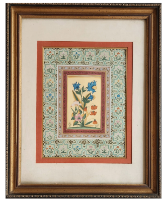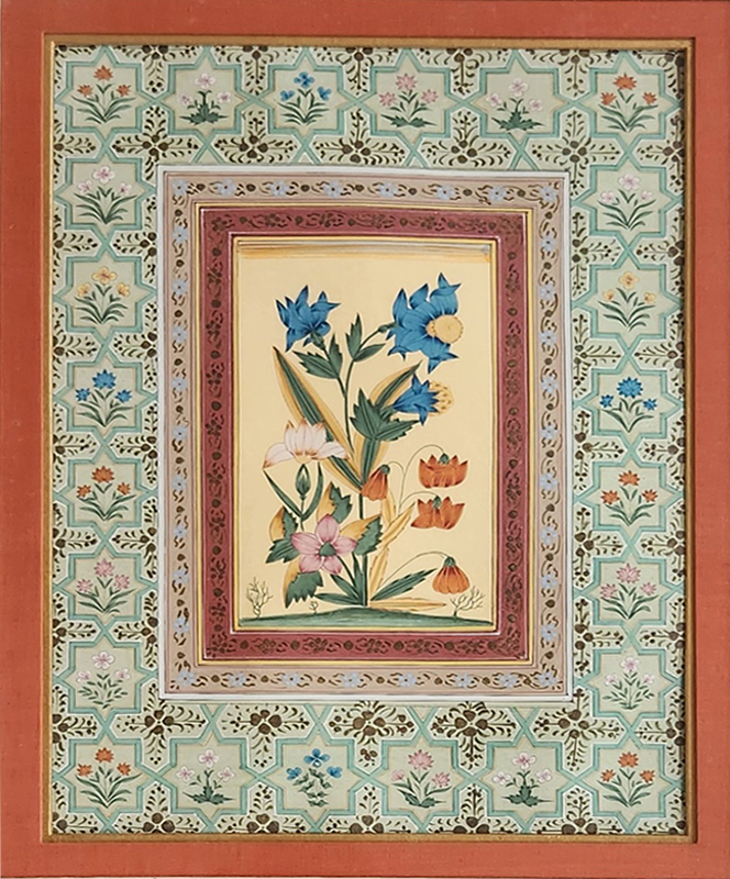 A beautifully framed miniature painting featuring a vibrant floral arrangement set against an intricate Persian-inspired geometric background.