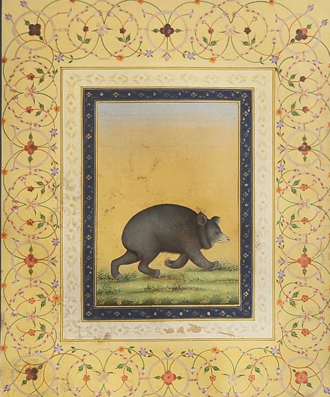 A traditional miniature painting depicting a bear walking in a garden, surrounded by intricate floral patterns.
