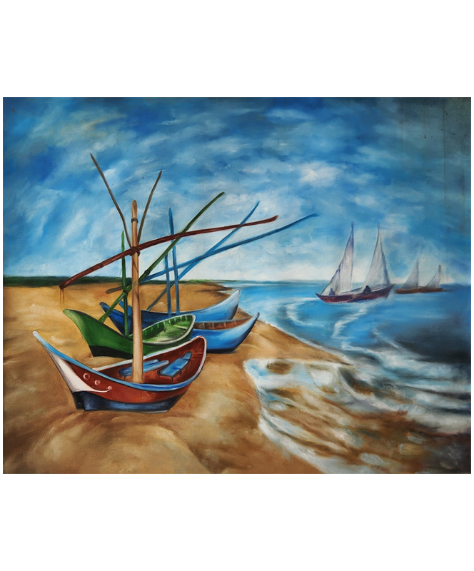 A vibrant oil painting of docked boats and distant sails under a breezy sky, hand-painted with original mineral pigments.