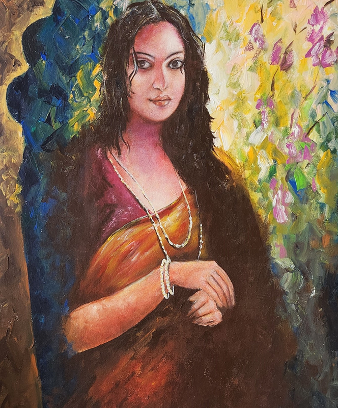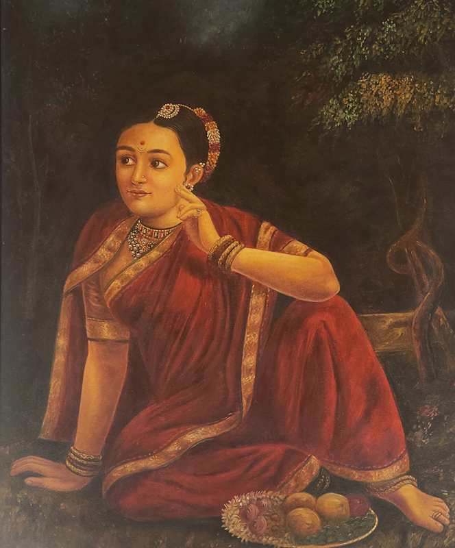 A captivating oil painting of a lady seated gracefully, adorned in a saree and traditional jewellery, exuding timeless beauty.