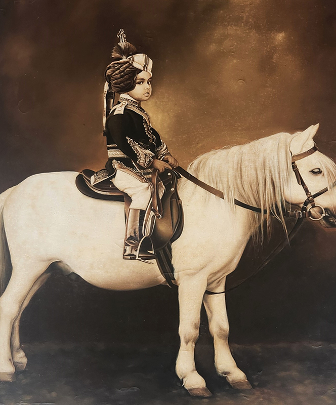 A majestic portrayal of a king's son seated regally on a horse, capturing the essence of royal grace and power.