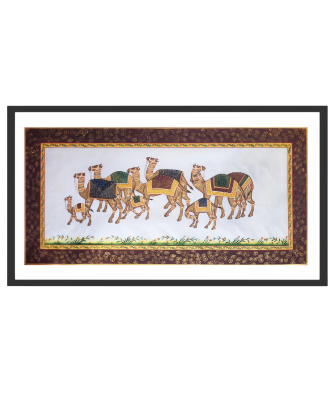 A luxurious silk artwork depicting a graceful caravan of ceremonial camels, painted using original mineral colors to evoke timeless desert grandeur.