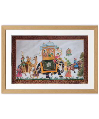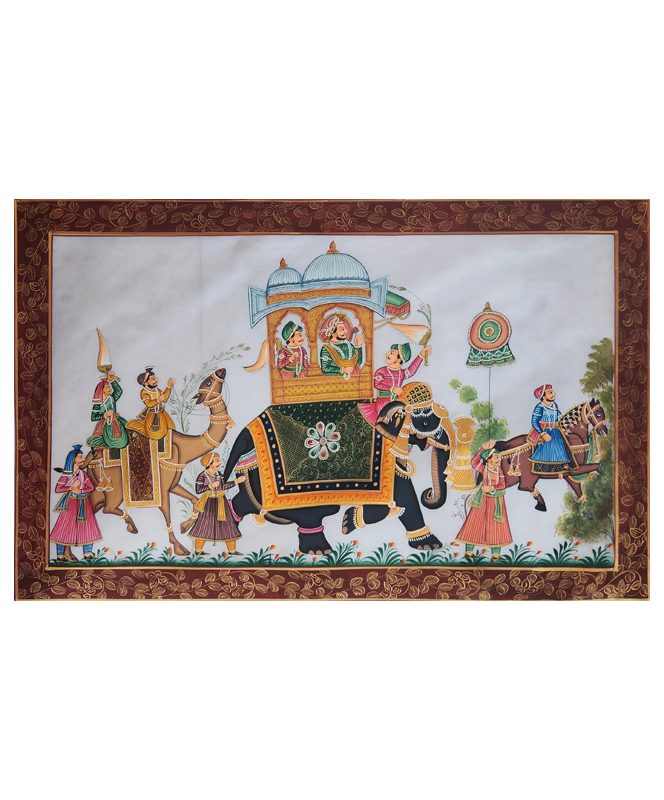 A majestic silk painting capturing a royal procession in full ceremonial splendor, hand-painted using original mineral pigments.
