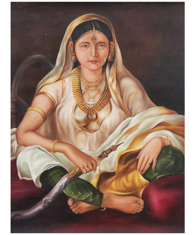 A regal woman in traditional Indian attire sits poised with a sword, embodying grace, strength, and timeless heritage.
