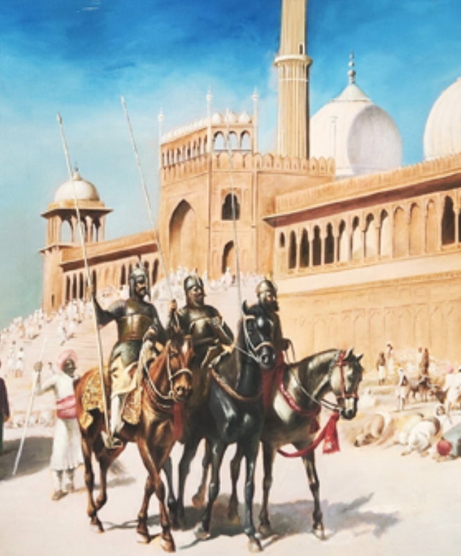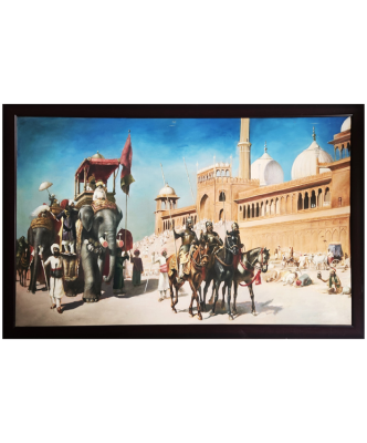 A majestic depiction of a royal procession with elephants and horsemen in front of a grand mosque.