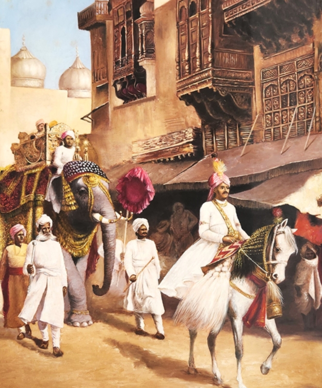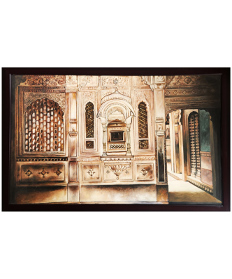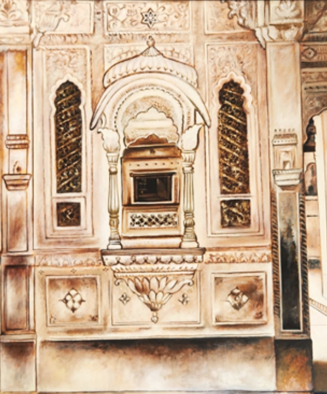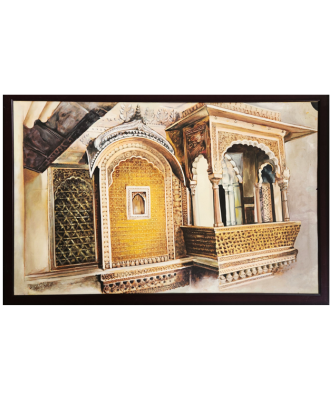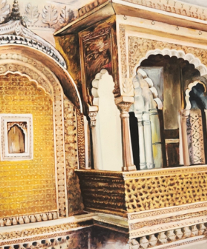 An intricate oil painting depicting a traditional Indian balcony with ornate architectural details.