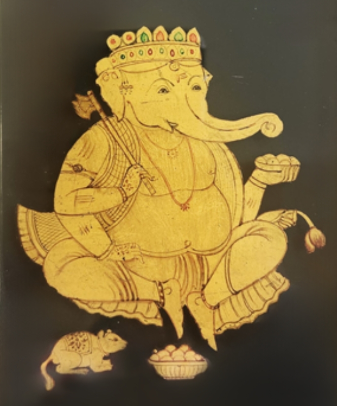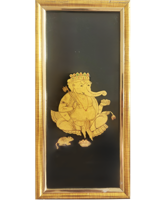 A vertical gold-painted miniature of Lord Ganesha, intricately detailed on a black background with a golden frame.