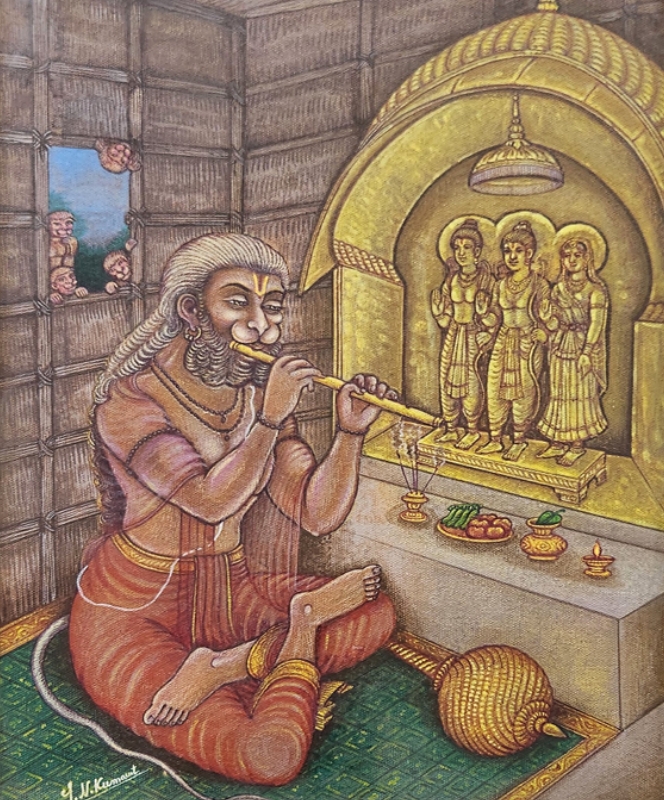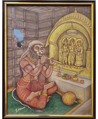 A detailed vertical miniature painting of Lord Hanuman in worship of Ram, Sita, and Laxman, adorned with traditional elements.