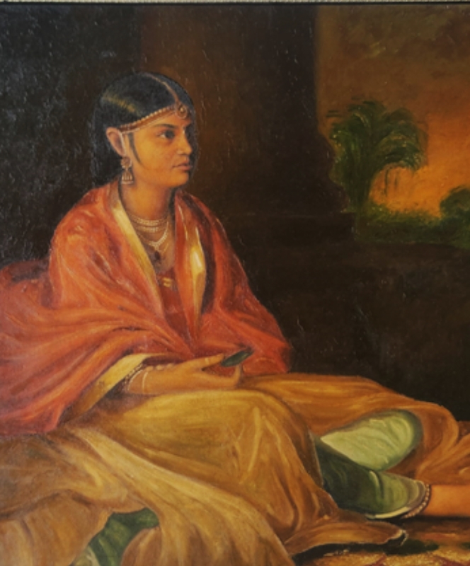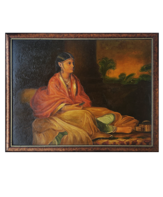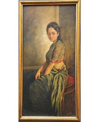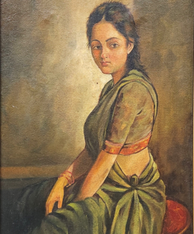A contemplative woman in traditional attire sits gracefully on a stool, captured in an oil painting.