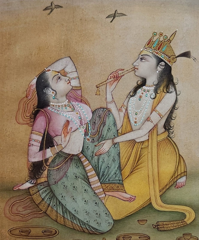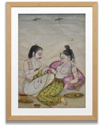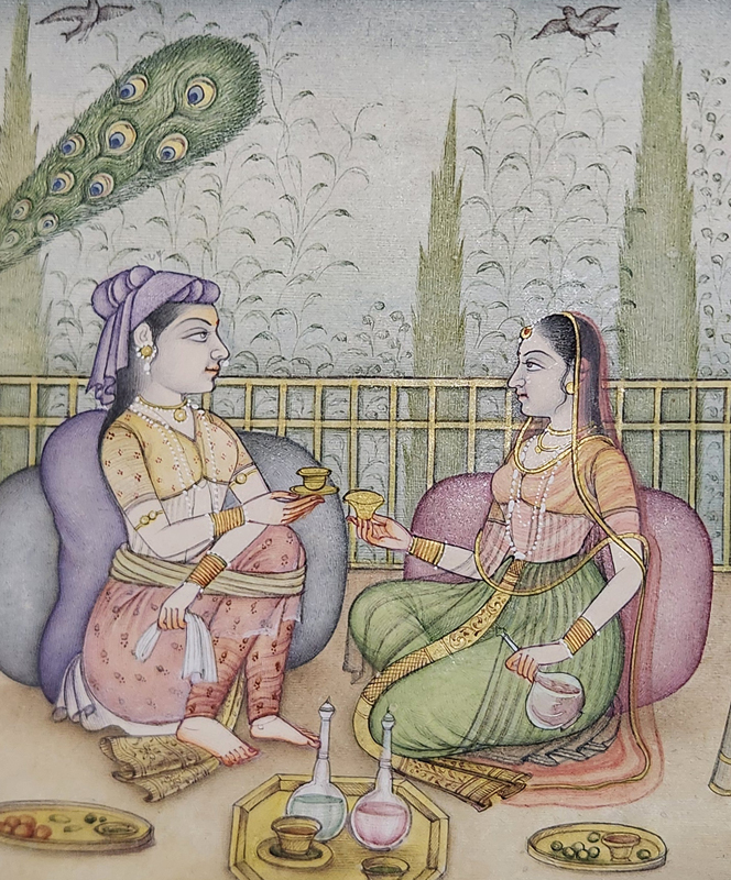 A traditional Indian miniature painting depicting two royal companions in a moment of leisure.