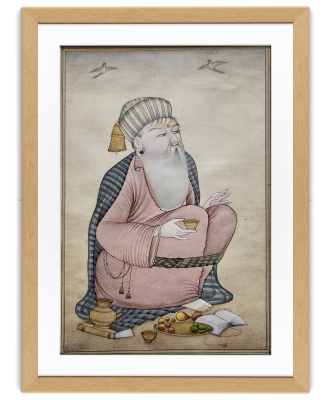 A detailed miniature painting depicting a sage in a meditative pose with various objects around.