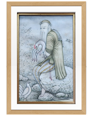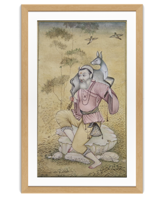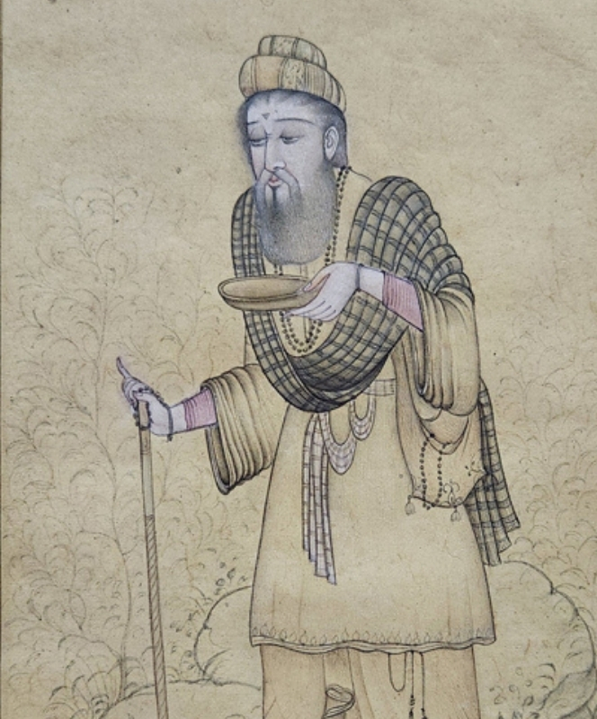 A detailed Indian miniature painting depicting an ascetic holding a bowl and staff, surrounded by nature.