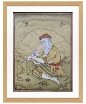 A detailed miniature painting depicting a scholar holding a child with weighing scales and books nearby.