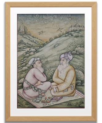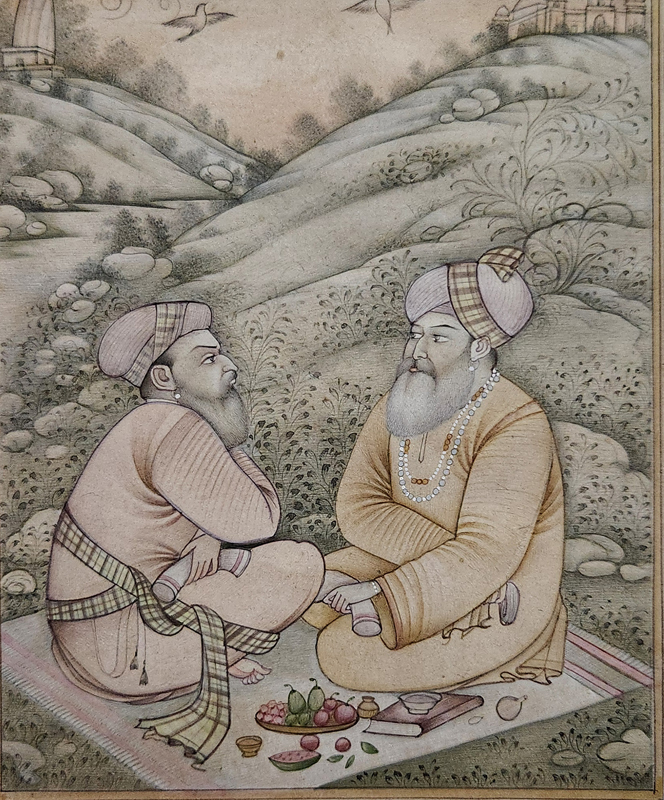 A detailed miniature painting depicting two individuals engaged in a peaceful conversation amidst a hilly landscape.