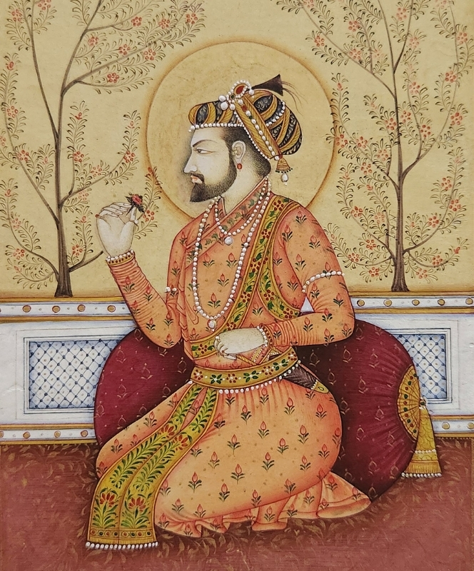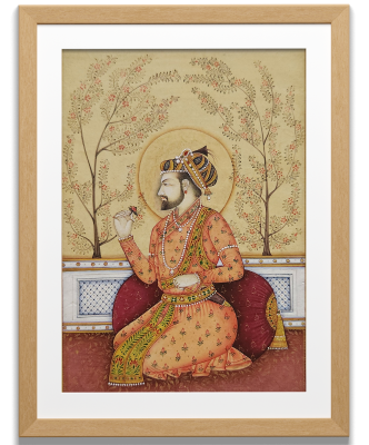 A detailed miniature painting depicting a royal figure adorned in traditional attire, holding a flower.